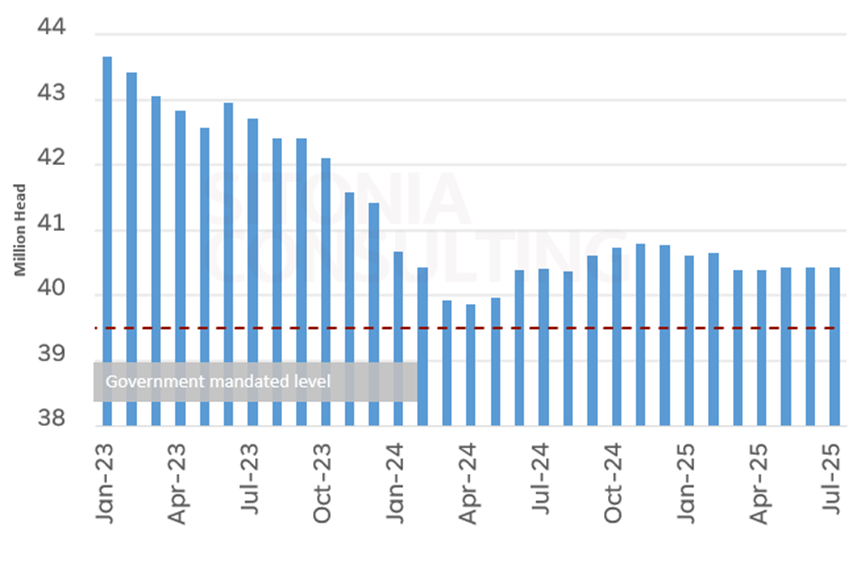 The government reiterated that the sow population needs to be reduced by 1 million. The sow population has been relatively stable in recent months and was at 40.42 million in July.